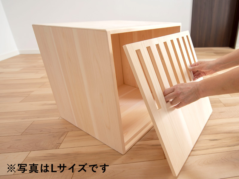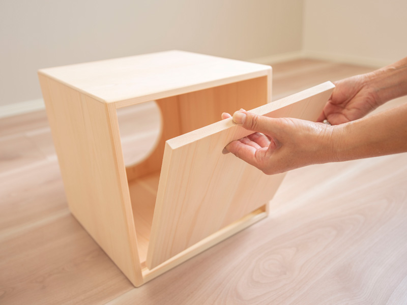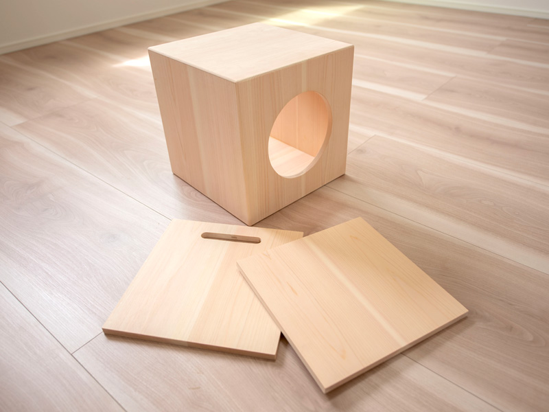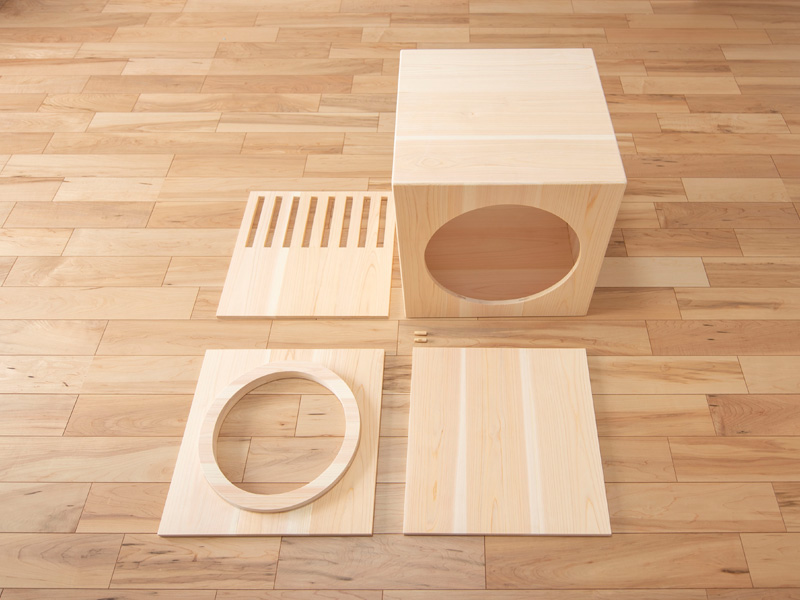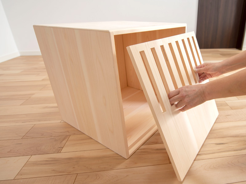 天然木そのものの素材感を損なわないよう、無垢のヒノキから、職人が一台一台手作業で丁寧に作っています。余分な装飾や機能を省いたシンプルなデザインで、和室・洋室問わず、どのようなお部屋にもマッチします。