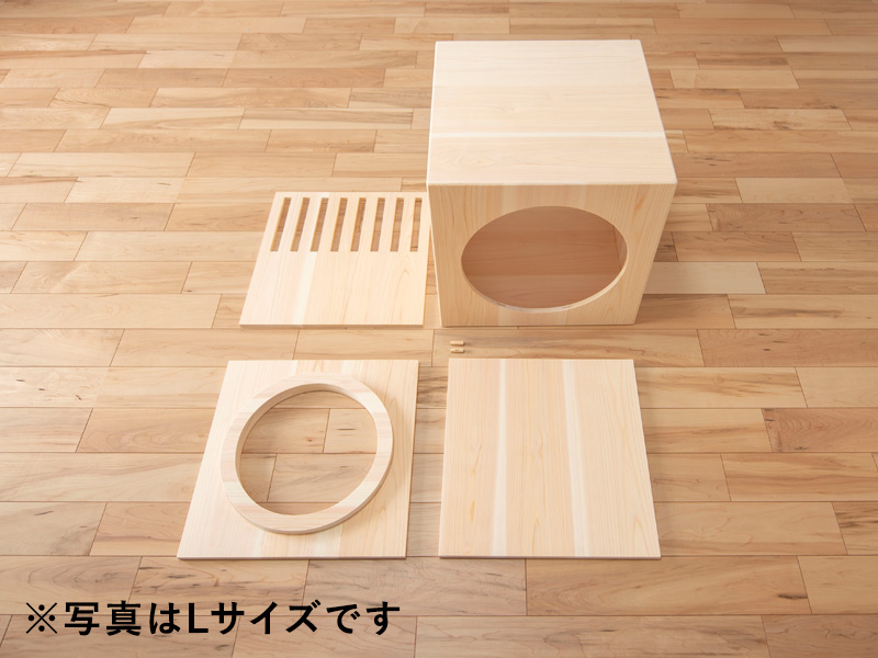 同梱品:ねぐらL本体、入口パーツ、床パーツ、背面パーツ、ダボ2本、木槌1本